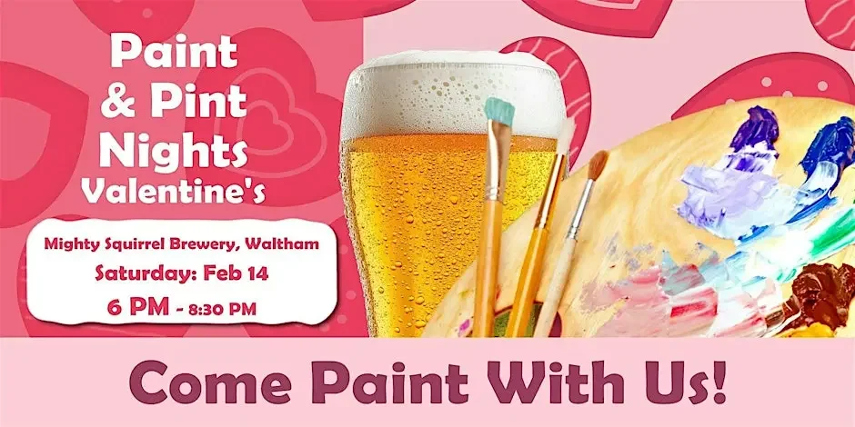 Celebrate Valentine’s season with Paint & Pint Nights at Mighty Squirrel Brewery in Waltham! Join us on Friday, Feb 14 at 6:00 PM for a fun evening of painting and craft brews. No experience needed—our instructor will guide you step-by-step while you create your own masterpiece. Bring your sweetheart, friends, or family and enjoy a relaxed, creative night out. Cheers to making memories and celebrating love with art and drinks!
