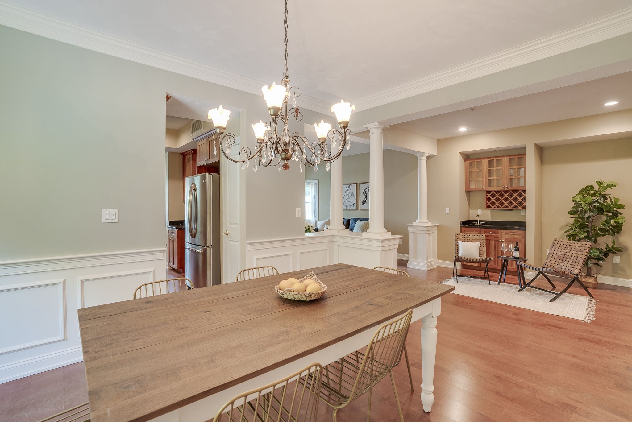 Experience refined living in this sophisticated first-floor corner unit, newly painted and meticulously upgraded. The open and elegant living area includes a wet bar, wine cabinet, wainscoting, and crown molding in the dining room. Relax by the gas fireplace with its graceful mantel and step out to your private patio. The sunlit kitchen is connected to a charming breakfast room. Both bedrooms feature private en suites. Enjoy two parking spaces and a spacious storage unit in the underground, climate-controlled garage. Perfectly situated near all the conveniences of Bedford, Burlington, and Routes 3 and 128 for effortless accessibility.